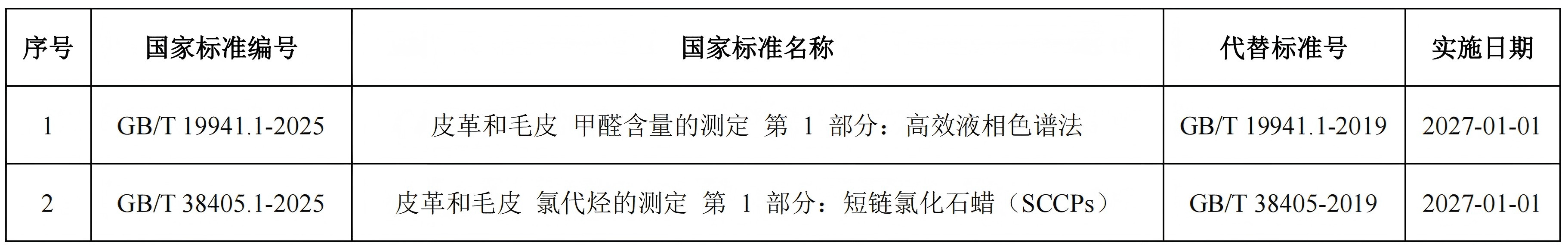 近日,国家市场监督管理总局(国家标准化管理委员会)发布2025年第33号公告,批准发布了261项推荐性国家标准。由全国皮革工业标准化技术委员会归口管理的《皮革和毛皮 甲醛含量的测定 第 1 部分:高效液相色谱法》《皮革和毛皮 氯代烃的测定 第 1 部分:短链氯化石蜡(SCCPs)》国家标准位列其中,具体标准信息如下表所示。