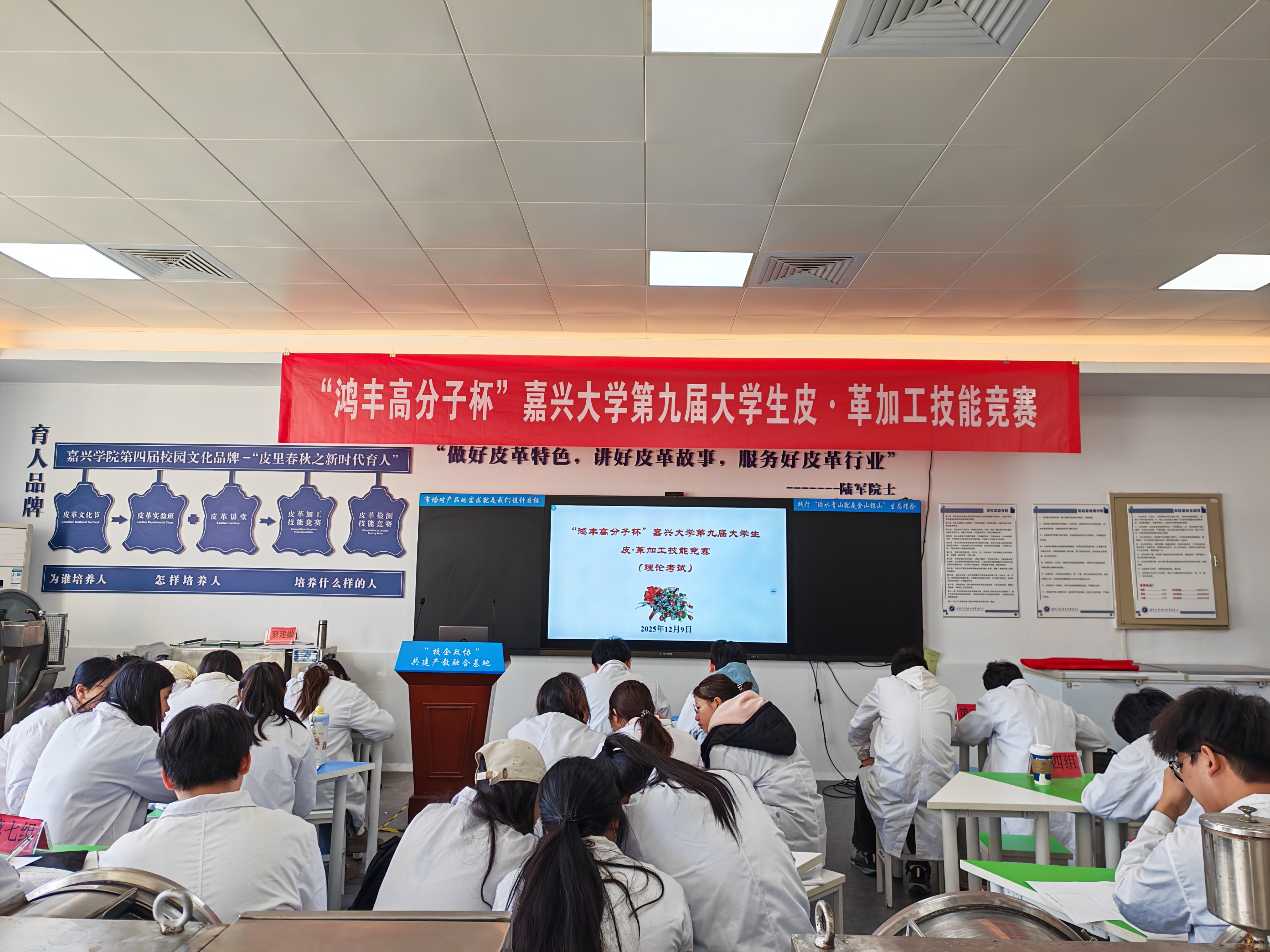 12月9~13日,“鸿丰高分子杯”嘉兴大学第九届大学生皮?革加工技能竞赛在轻化工程智慧实验室举行。嘉兴大学轻化工程专业负责人罗建勋教授及部分骨干教师参加指导,轻化231全体学生、轻化2024级部分学生参加了本次竞赛。