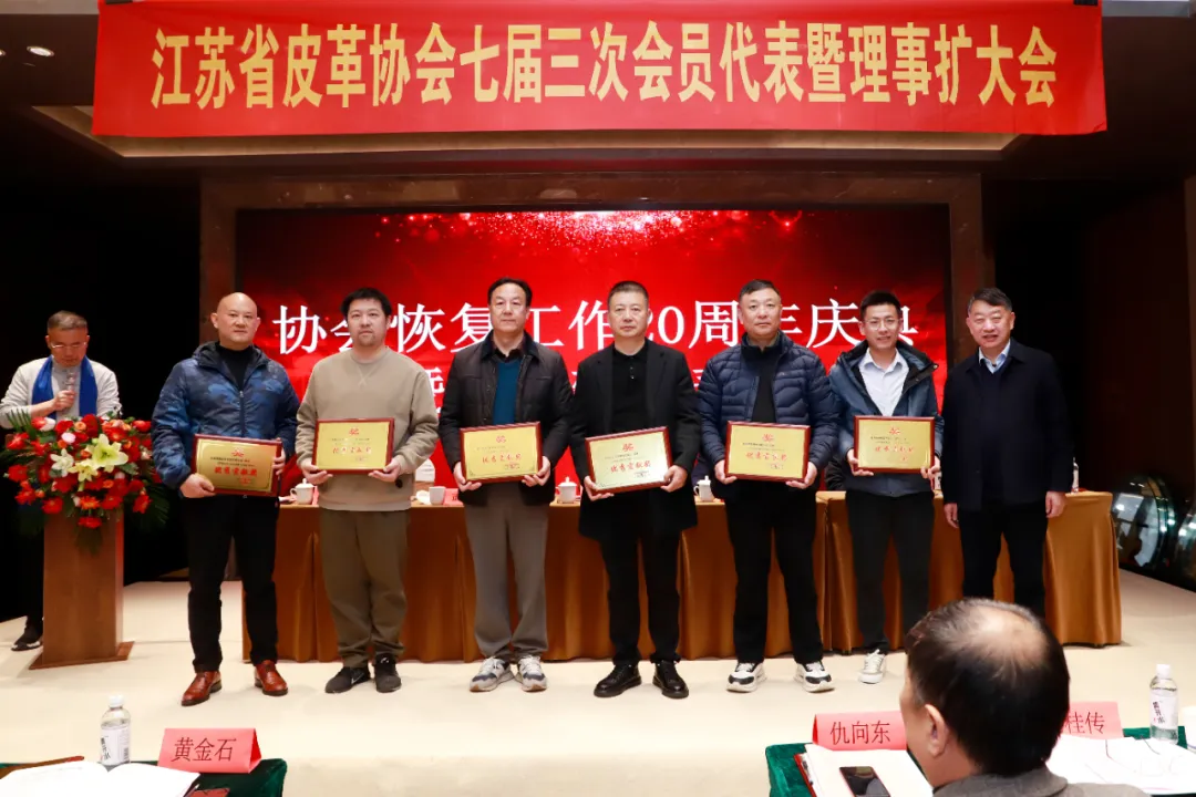 为表彰在江苏省皮革协会恢复工作20周年(2005-2025)历程中表现突出的先进集体,经理事长会议研究决定,对相关单位授予“特别贡献奖”“杰出贡献奖”和“优秀贡献奖”荣誉表彰。协会副理事长、扬州市邗江区鞋业商会会长朱炳富宣读《关于表彰江苏省皮革协会恢复工作20周年(2005-2025)“特别贡献奖”“杰出贡献奖”和“优秀贡献奖”单位的决定》